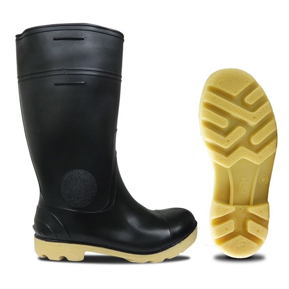 Estas botas están hechas de PVC o polivinilo cloruro, cuenta con un diseño de sistema de molde o inyección T/S primero la caña y sucesivamente la suela; revestida por el interior por una media de nylon. Su uso es diverso y para mayor protección trae una puntera de acero.